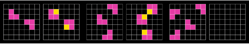 Each pair of grids shows an input and an output, though the output for the third pair is empty. The task is to infer the relationship for the two completed pairs and then give the output for the last pair using the same relationship. In this case, you would copy all the pink squares over and add a yellow square wherever it would turn an L-shape into a larger 2x2 square.